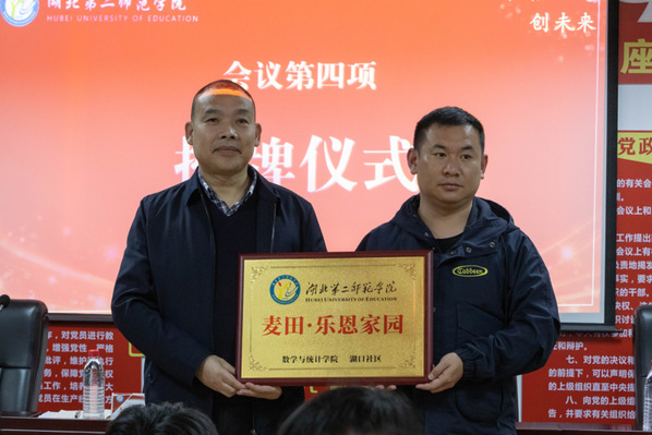 本网讯(通讯员孙玉盈)4月6日下午,我校数学与统计学院(以下简称“数统院”)在佛祖岭街道湖口社区会议室举行麦田·乐恩家园项目启动仪式,湖口社区党委书记肖平,东湖新技术开发区市场监督管理局科长金昊,湖口社区党委副书记钱欢欢,数统院分党委书记林志红、副书记严国涛参加。