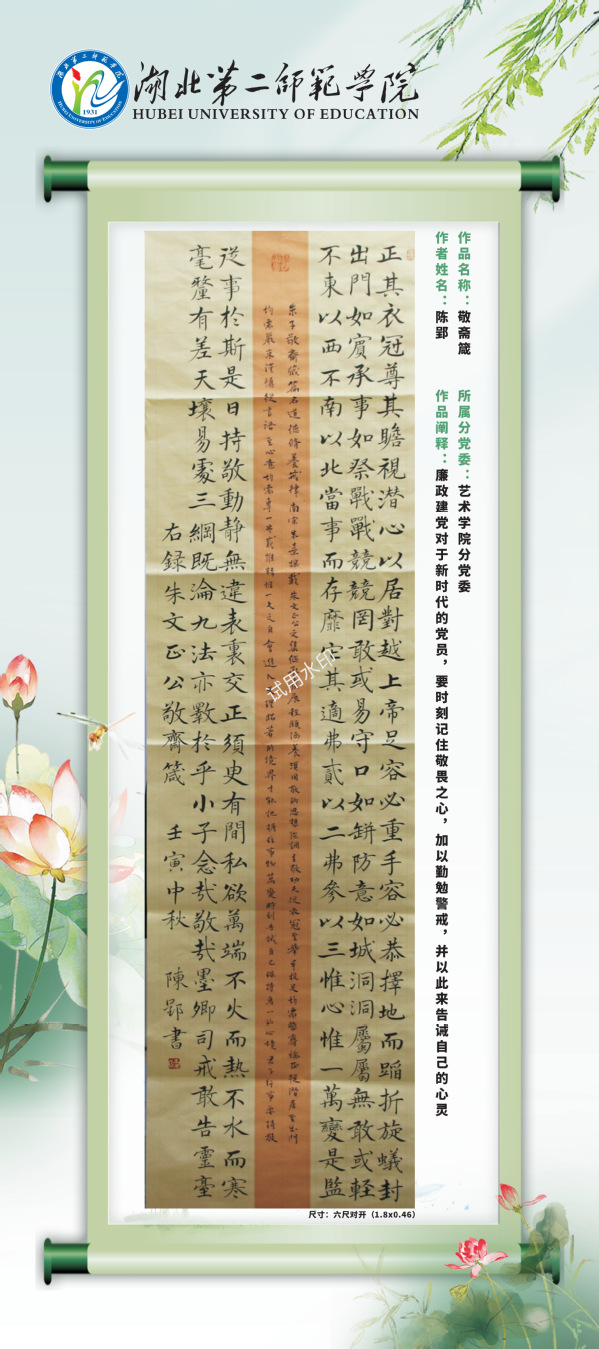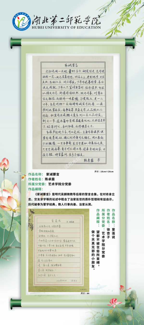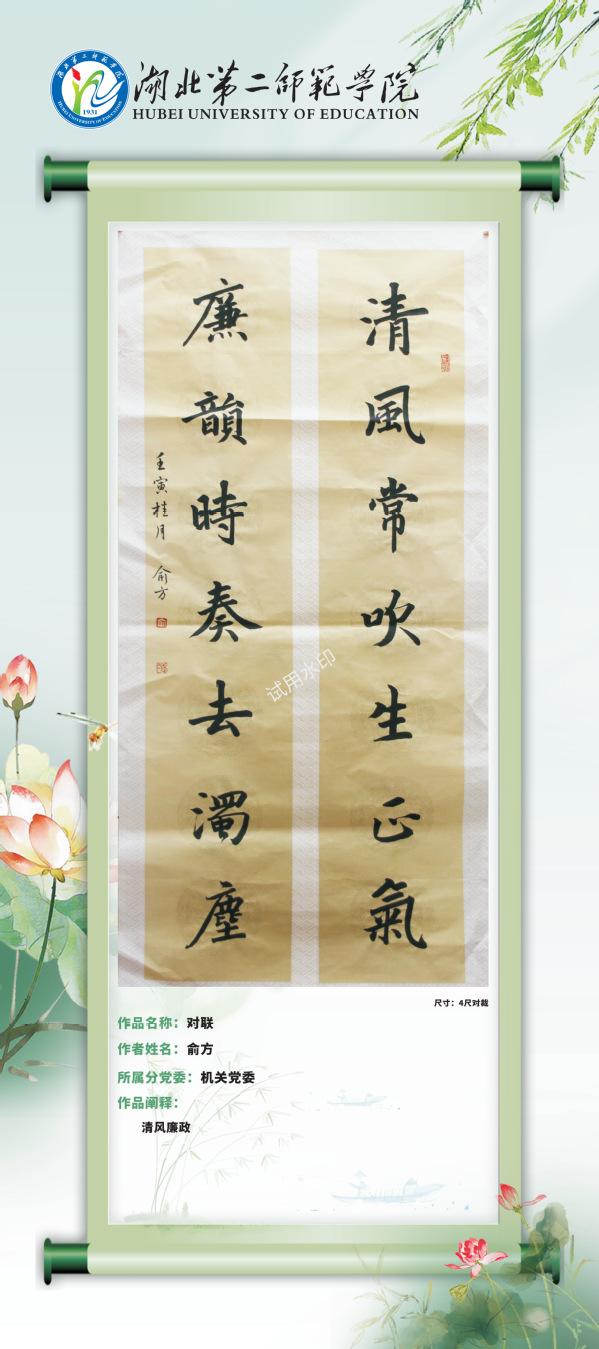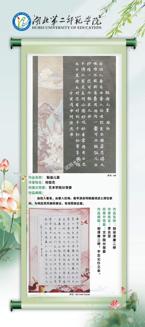 现结合党风廉政建设宣教月活动,通过校园网络平台对廉洁教育活动中征集到的廉洁视频和书画作品择优进行展示,引导学校师生进一步夯实清正廉洁思想根基、厚植廉洁奉公文化基础、培养廉洁自律道德操守、弘扬崇廉拒腐社会风尚,不断增强廉洁治校、廉洁从教、廉洁育人、廉洁修身意识。