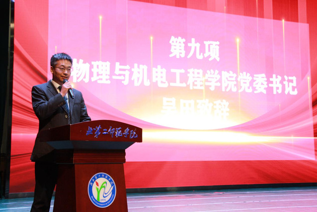 本网讯(通讯员沈子颖 摄影刘克圣 田宇轩)10月13日晚,物理与机电工程学院(以下简称“物机学院”)于学校大礼堂举办2023级新生开学典礼,科研处处长肖明、后勤保障部党总支书记刘晖,物机学院党委书记吴田、党委副书记陈扬、副院长吴建兵、副院长李杰,各系主任、专业负责人,23级“师友”班导、“学友”班助,优秀校友代表,教师代表及2023级全体新生参会。陈扬主持典礼。