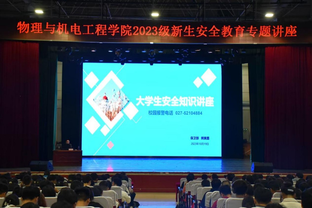 本网讯(通讯员 陈久若)为加强全体新生的安全意识,保护大学生的生命与财产安全,10月19日晚,物理与机电工程学院(以下简称“物机学院”)于学校大礼堂开展新生安全教育专题讲座。主讲人为保卫处副处长熊寅墨,2023级全体新生参加讲座,物机学院学工办主任冯媛媛主持。