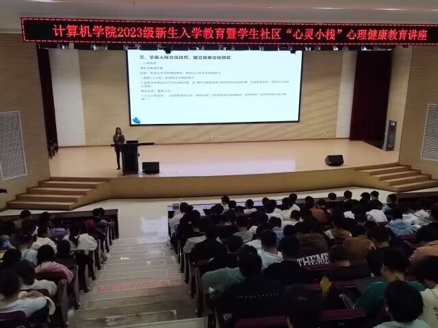本网讯(通讯员 郑国媛梅一峰)11月9日下午,计算机学院在新图书馆二号报告厅举办以“人际关系与适应”为主题的心理健康教育讲座。讲座邀请了湖北第二师范学院心理健康教育中心邵航老师担任主讲人,心理健康工作指导老师冯诚、辅导员郝阳老师及2023级全体新生共同参与。