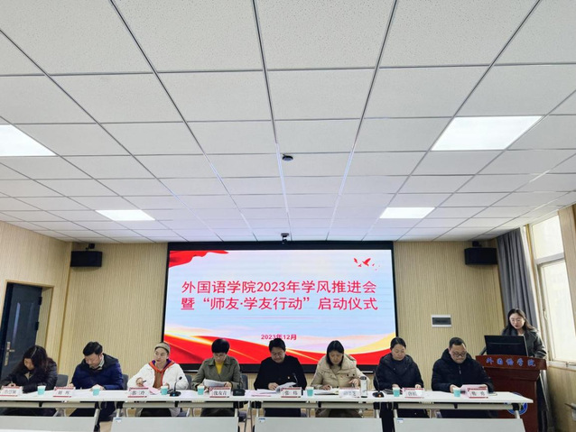 本网讯(通讯员 刘佳睿)12月12日下午,外国语学院在学院3楼会议室举行2023年学风建设推进会暨“师友·学友行动”启动仪式。外国语学院“师友·学友行动”联系单位国际交流处、研究生处、两训中心相关负责人,学院全体班子成员、辅导员及学生代表参加活动。仪式由钱晓琳老师主持。