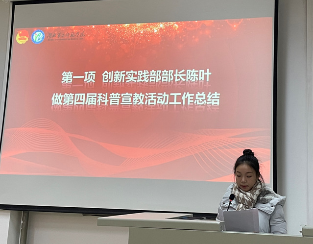 学院团委创新实践部部长陈叶对第四届科普宣教活动工作进行全面总结,四年来,科普宣教活动为营造学院良好学习氛围起到积极推动作用,活动以大学生核心素养培育为核心,主动融入学院人才培养体系和学科专业发展,开展科普学习、科普展示、科普辐射、科普拓展四项计划。孙晨宣读学院2023年第四届科普宣教活动暨学风建设月表彰文件,邱梦莹和高丽娥为学风建设月各项活动中的先进集体和优秀工作者颁奖并合影留念。优秀工作者代表程玲上台发言,分享了她在活动中的心得体会,表达了对未来工作的热情和期待。张灏宣读首届“印象化生”作品征集大赛、文明标兵寝室评选、最美笔记等活动获奖同学名单,雷晓林为获奖同学颁奖并合影留念。