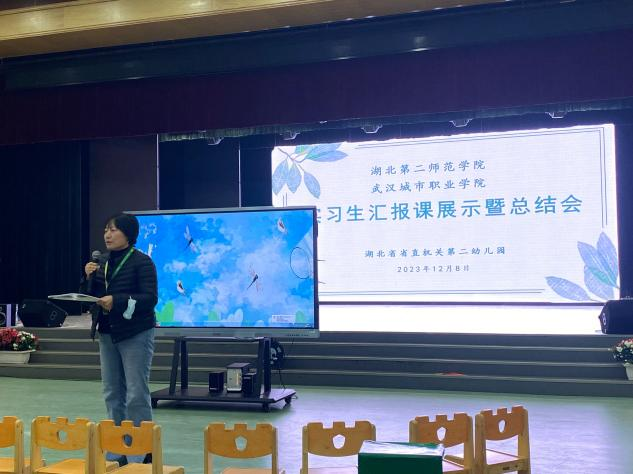 我校实习带队老师陈纳博士受邀讲话。她首先感谢省二幼为武城职和湖二师精心搭建的校际交流平台,指出此次活动能够很好地提升学前教育毕业生的职业素养,让学生在展示自身风采的同时获得相互学习借鉴的机会;对武城职实习带队老师们以工匠精神进行教书育人表示敬意。随后,陈老师充分肯定了本校毕业生们在实习期间的表现,并满怀诚挚地对省二幼各位实践导师的辛勤付出表示衷心感谢。她鼓励两校毕业生带着问题、带着思考继续加强理论和技能学习,不断促进自身能力的发展,让自己在幼儿教育的道路上走得更远。