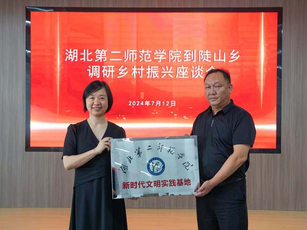 会上校新闻中心主任兼宣传部副部长谢莎向陆东村授牌“湖北第二师范学院新时代文明实践基地”。