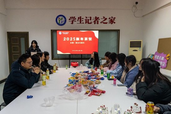 本网讯(学通社记者 罗梦瑶)1月9日晚,行政楼537记者之家一片欢声笑语,校大学生通讯社2025新年茶聚在轻松热烈的氛围里举行。校新闻中心主任兼宣传部副部长谢莎、副部长孟黎明、化生与生命科学学院党委副书记程丽鹃、宣传部学通社指导老师夏锐出席。