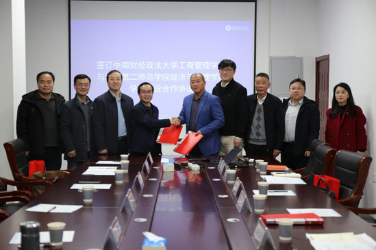 本网讯(通讯员 魏雪晴)3月9日下午,我校经济与管理学院与中南财经政法大学工商管理学院,在经管学院会议室召开学科建设协作会,并签订合作框架协议。副校长吕辉出席,经管学院院长陈池波主持会议,中南财经政法大学研究生院、工商管理学院负责人,我校学科建设办公室、科研处,经济与管理学院相关负责人、教师代表参会。