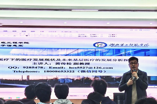 本网讯(通讯员 金琰 叶语彤)11月6日,物理与机电工程学院在实验中心一号楼3楼报告厅举办“基于智慧医疗下的医疗发展现状及未来基层医疗的发展分析探讨”专题讲座。讲座特邀湖南盘庚科技有限公司董事、副教授黄传松担任主讲,新生代表参与活动。