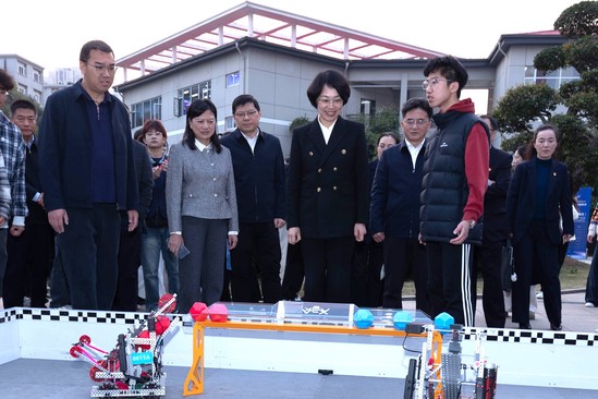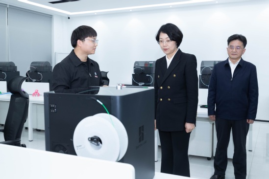 在数智光电产业学院,陈平详细了解智慧生产线、3D打印实验室建设情况,并观摩教学演示。得知学校部分教具可通过3D打印实现自给自足,她点头肯定。