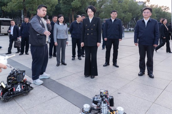 在行知广场,陈平现场观摩“智汇青春”科创作品展。这里正在集中展示我校在大学生创新大赛、挑战杯大赛中获国家级、省级奖项等30余个科创精品作品。“交给大家一个任务”,在计算机与人工智能学院展区,陈平看着跳舞的“科目三机器人”对演示学生说:“如果做一台AI春晚,需要一些机器人表演,能不能结合荆楚文化,编排一些动作?”。师生们微笑,点头应答。在外国语学院直播助农项目展台前,陈平详细询问助农细节说:“下次给我发个链接,直播我要来看看!”