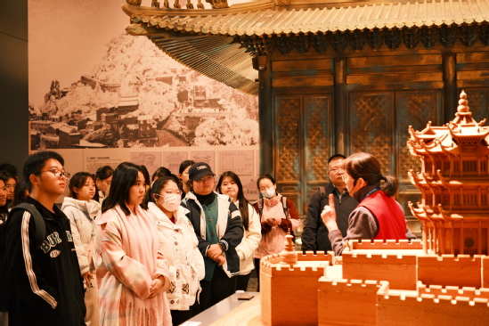 自主参观后,在讲解员引导下,同学们重点探访荆楚建筑展厅。展厅以“金道锡行、通衢开埠”为主线,清晰勾勒出从古代楚台到现代地标的演变脉络。讲解员既解读了楚式建筑“斗拱飞檐”的形制特色与“天人合一”的营造智慧,又结合清代黄鹤楼精细模型,阐释其72柱对应七十二候、28檐象征二十八星宿的文化内涵,让同学们对“象天法地”的传统建筑设计思想有了深刻认知。