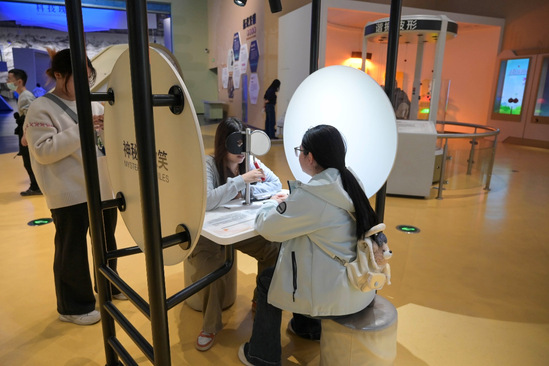 在展馆内,同学们参与了多项互动体验:透过镜面反射感受光学奇妙,体悟传统哲思与现代科学的相通;操作离心力装置捕捉物体运动轨迹,直观理解物理规律;通过陀螺装置验证角动量守恒定律,让抽象知识变得可感可触。