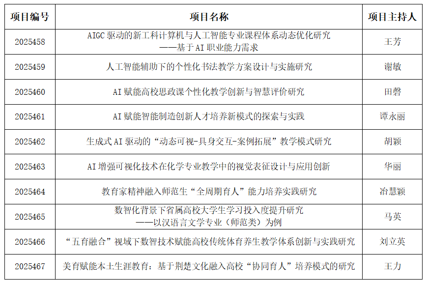 本网讯(通讯员 陈曦)近日,湖北省教育厅发文公布2025年湖北本科高校省级教学改革研究项目立项名单,我校《AIGC驱动的新工科计算机与人工智能专业课程体系动态优化研究——基于AI职业能力需求》等10个项目获批立项。