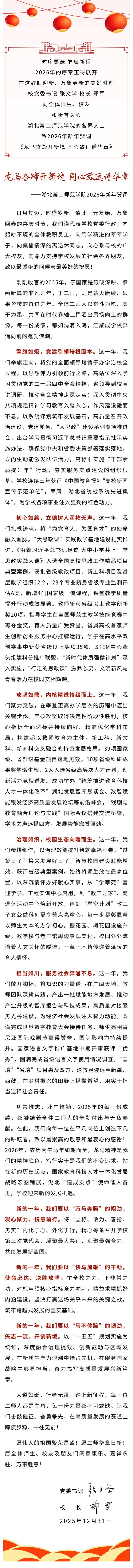 龙马奋蹄开新境 同心致远谱华章——湖北第二师范学院2026年新年贺词